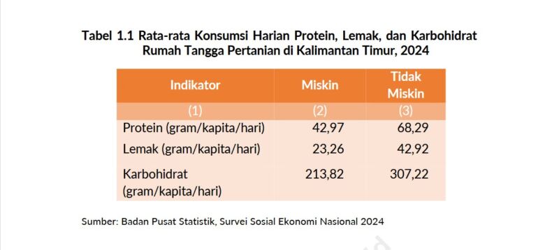 “Jika melihat rata-rata konsumsi harian protein, lemak, dan karbohidrat rumah tangga petani miskin di Kaltim, secara umum berada di bawah standar kecukupan yang ditentukan oleh Peraturan Menteri Kesehatan Republik Indonesia,” ungkap Yusniar.