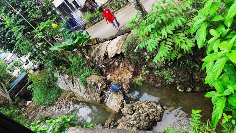 Saluran utama di RT 12 Bukit Pinang roboh usai tak mampu menahan derasnya aliran banjir. (Niaga.Asia/Lydia Apriliani)