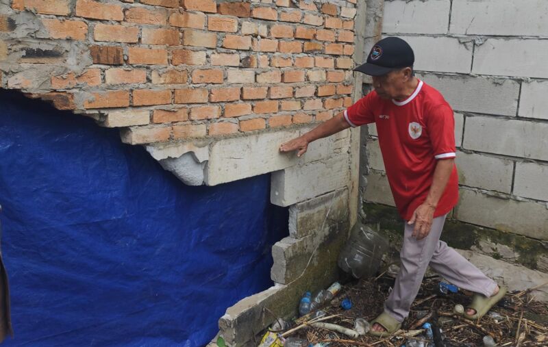 Wiyono, Ketua RT 12 Bukit Pinang, melihat langsung kerusakan dinding rumah warga yang jebol diterjang air pada tanggal 19 September 2025. (Niaga.Asia/Lydia Apriliani)