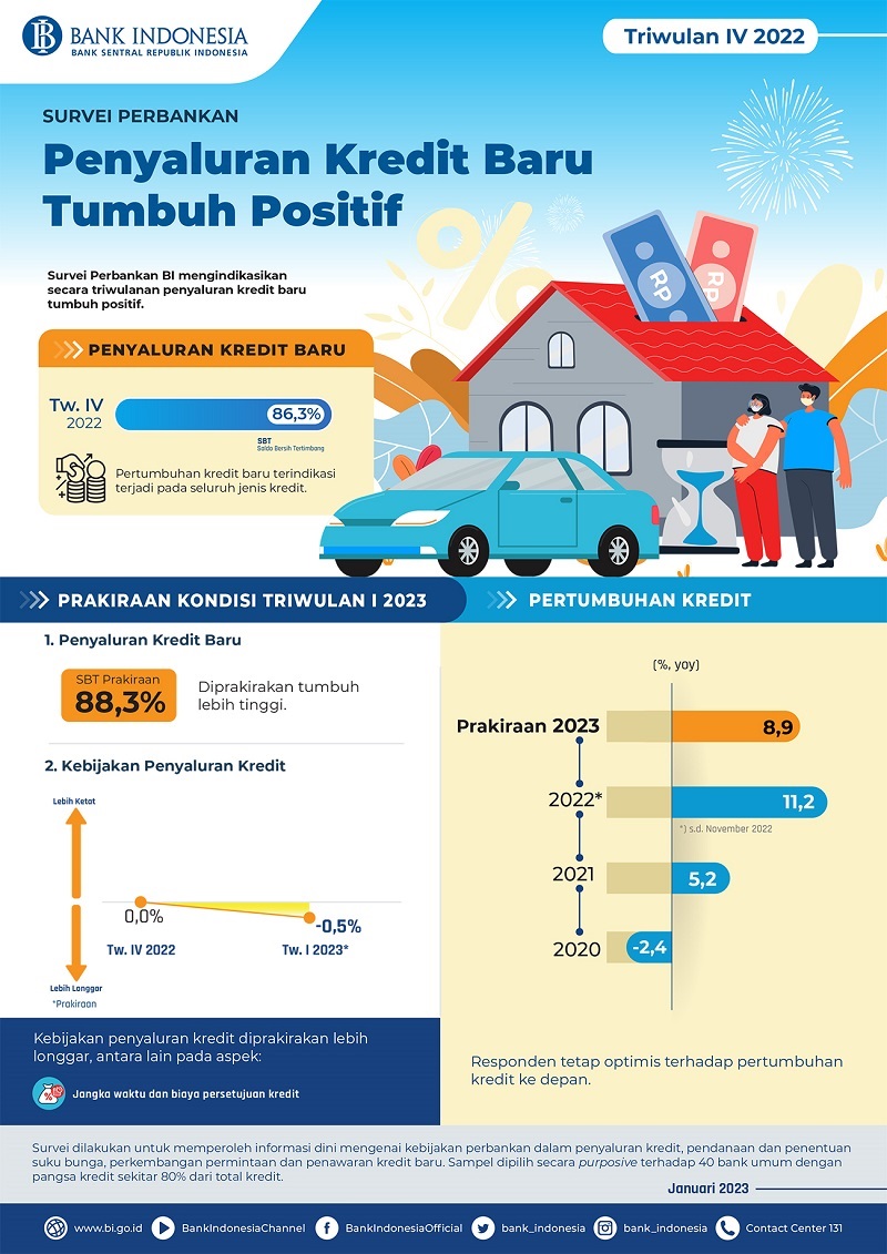 “Hasil survei menunjukkan responden tetap optimis terhadap pertumbuhan kredit ke depan. Responden memprakirakan pertumbuhan kredit pada 2023 sebesar 8,9% (yoy),”pungkas Erwin.