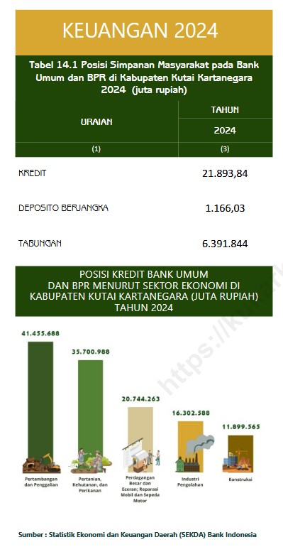 “Total nominal tabungan yang dihimpun dari masyarakat oleh Bank Umum dan BPR di wilayah Kukar pada tahun 2024 mencapai Rp6.391.844 juta dan depositi berjangka 1,166 triliun. Kemudian posisi kredit yang disalurkan oleh Bank Umum dan BPR di Kabupaten Kutai Kartanegara tercatat sebesar Rp21.893.840 juta.