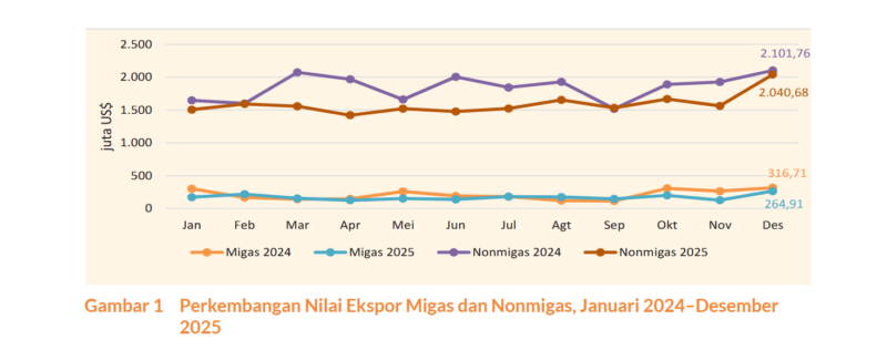 Sementara itu, nilai ekspor nonmigas tercatat sebesar US$2.040,68 juta, lebih tinggi jika dibandingkan dengan nilai ekspor nonmigas November 2025 yang tercatat sebesar US$1.559,43 juta.