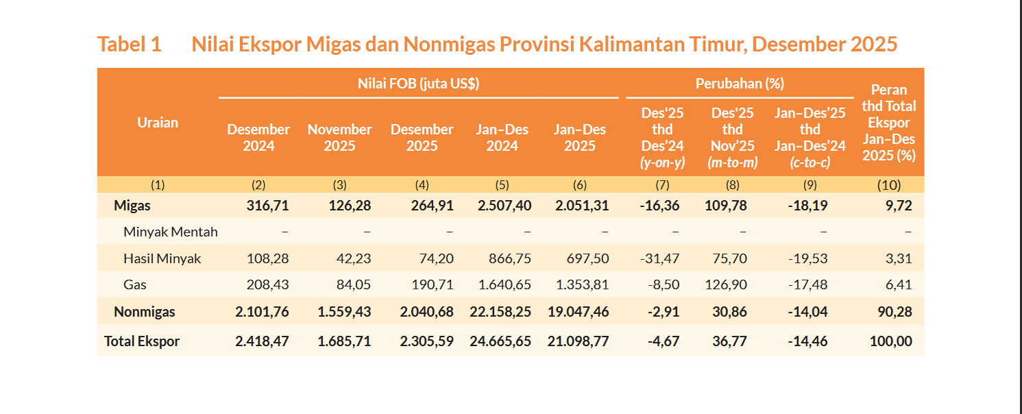 Secara kumulatif nilai ekspor Provinsi Kaltim selama Januari–Desember 2025 tercatat sebesar US$21.098,77 juta, atau turun 14,46 persen dibandingkan dengan periode yang sama pada tahun 2024.