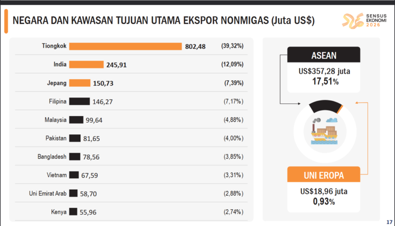 SAMARINDA.NIAGA.ASIA – Selama periode Januari–Desember 2025, Tiongkok merupakan negara tujuan ekspor utama komoditas Kalimantan Timur (Kaltim). Tiongkok memiliki peranan terbesar dengan nilai ekspor sebesar US$6.637,93 juta (34,85 persen), diikuti India dengan nilai sebesar US$3.030,10 juta (15,91 persen), dan Filipina sebesar US$1.552,22 juta (8,15 persen).