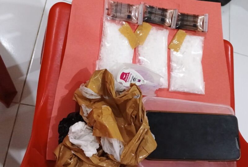 “Dari hasil pemeriksaan kotak, ditemukan 3 bungkus plastik ukuran sedang diduga narkotika jenis sabu seberat 150 gram,” sebut Primayantha.