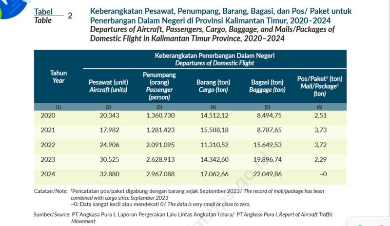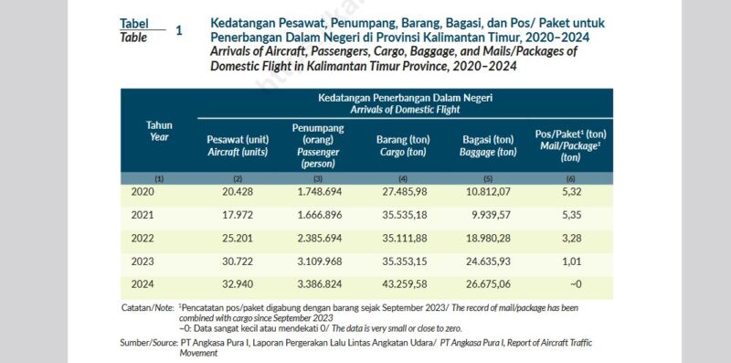 Demikian dilaporkan Badan Pusat Statistik (BPS) Kaltim dalam Publikasi Statistik Transportasi Udara Provinsi Kalimantan Timur Tahun 2024 yang dipublikasikan dilaman BPS Kaltim tanggal 30 Desember 2025.