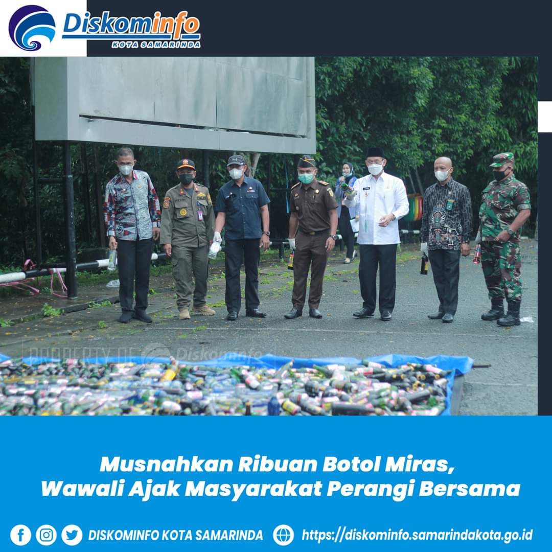 SAMARINDA.NIAGA.ASIA-Pemerintah Kota (Pemkot) Samarinda melaksanakan kegiatan pemusnahan minuman keras (miras) dari berbagai merk dan jenis serta ukuran di Lapangan Parkir Balai Kota Samarinda, Kamis (16/12/2021) pagi. Total ada 1.357 botol yang merupakan hasil penertiban di lapangan selama ini.