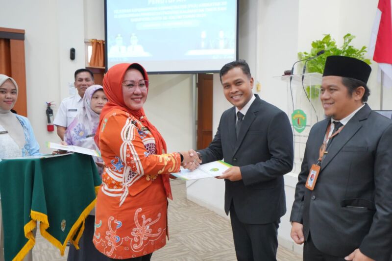 Kepala BPSDM Kaltim, Nina Dewi menyampaikan ucapan selamat kepada Wildan Taufik dari Kesbangpol Kaltim meraih peringkat pertama di Pelatihan Kepemimpinan Administrator (PKA) Angkatan XII. (Foto BPSDM Kaltim/Niaga.Asia)